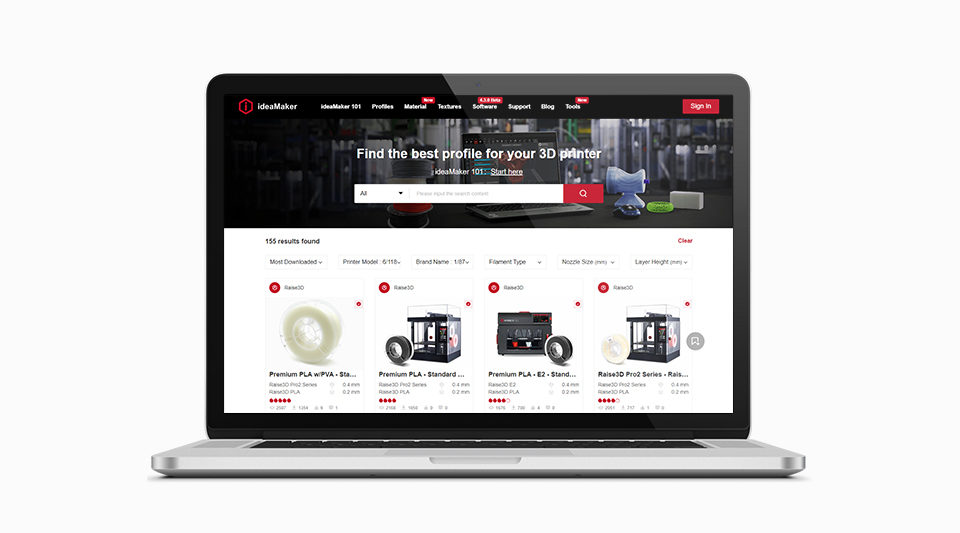 | ideaMaker Library ideaMaker Library надає користувачам профілі нарізки для різних ниток, включаючи нитки Raise3D і сертифіковані нитки OFP, спрощуючи налаштування параметрів друку для різних ниток |