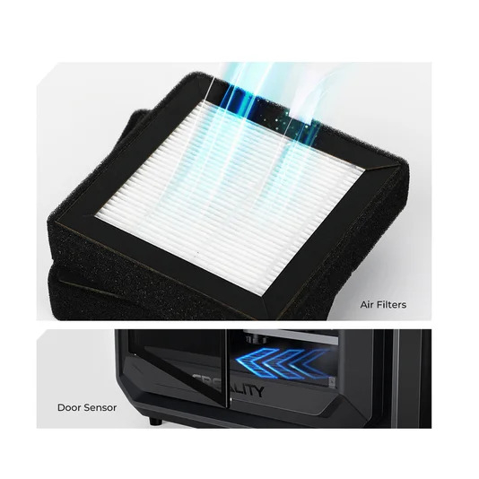 Sermoon D3 має 2 вбудовані фільтри HEPA, які очищують повітря від частинок PM0,3 і токсичних сполук, які утворюються під час друку, наприклад, ABS. Також він має датчик відкриття дверцят, який надсилає сигнал тривоги та призупиняє друк, і здатний швидко охолоджуватись, запобігаючи можливості опіків.